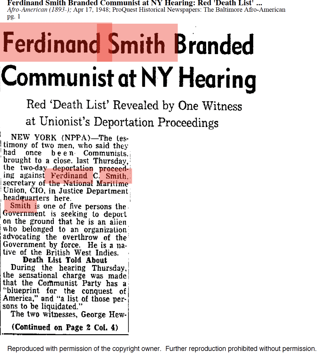 This had consequences. In 1947, after revelations that Smith was not a U.S. citizen, he was removed from his position as Secretary of the National Maritime Union. He had begun the citizenship process in 1920, when he filed an “intention” to become a citizen. Like many sailors, though, he had never followed up, and merchant seamen did not have to be a citizen of the United States to work on the U.S. merchant fleet. In early 1947, Smith was arrested for violated the Alien Registration Act of 1940, and sent to Ellis Island for deportation proceedings. Released on bond, he returned for the trial in July.